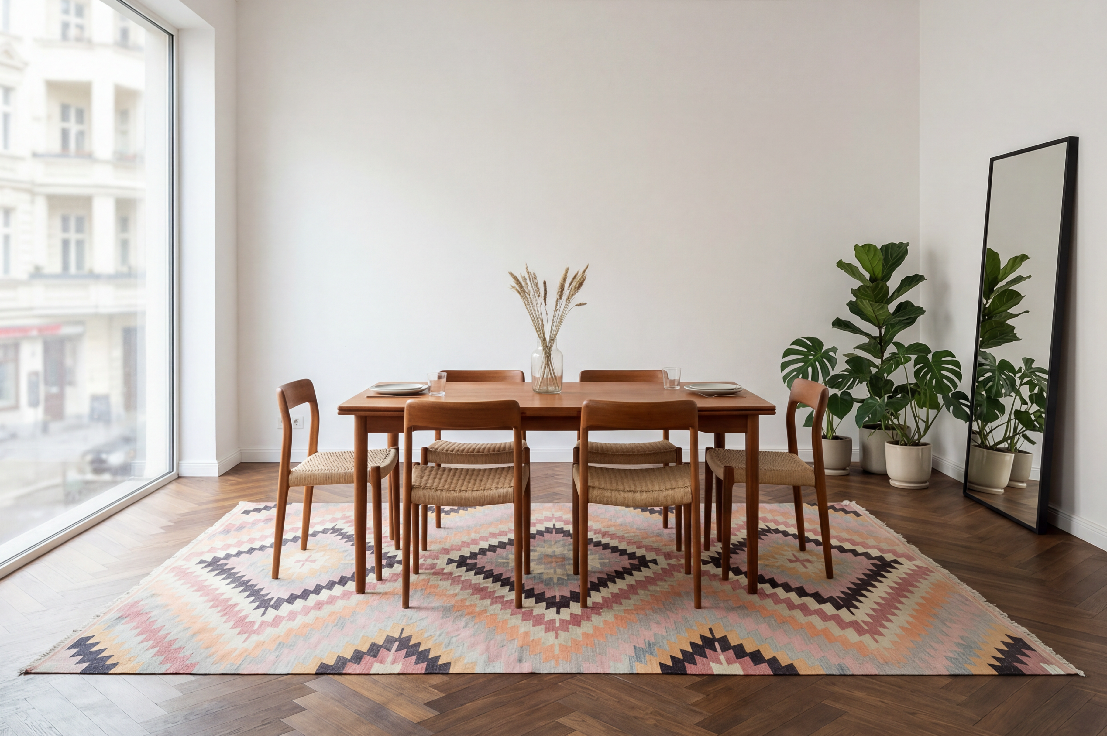 Ein Kelim bringt Wärme und gelebte Geschichte in dein Zuhause. In jedem dieser gewebten Kunstwerke erzählt sich eine Erzählung von Herkunft, Tradition und Zeit. Handgewebt aus Schafwolle, verändert ein Kelim die Atmosphäre deines Zimmers. Jeder Kelim entsteht in aufwendiger Handarbeit – mit der Erfahrung ganzer Generationen und tiefem Gefühl für das Handwerk. Wenn du über das Gewebe streichst, spürst du die Hingabe von Wochen und Monaten. So wird aus einem Kelim ein Teil von deinem Zuhause, der dich bereichert und seine ganz eigene Geschichte leise weitererzählt.